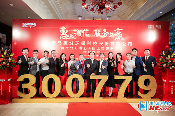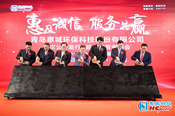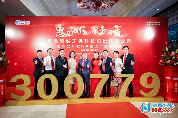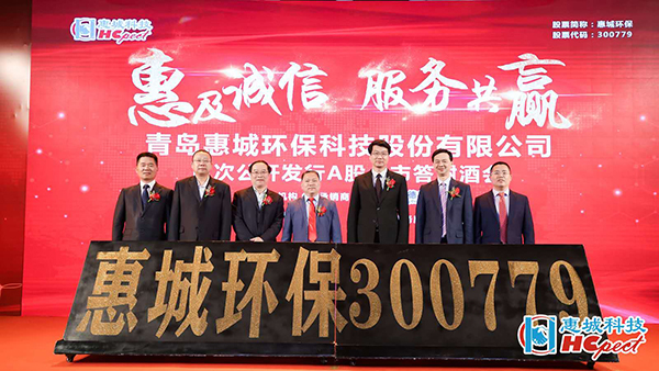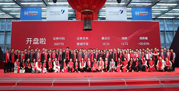5月22日上午,青島惠城環(huán)?萍脊煞萦邢薰旧鲜袃x式在深圳證券交易所東門8樓大廳正式啟動。青島市地方金融監(jiān)管局副局長王偉光、青島惠城環(huán)保科技股份有限公司董事長張新功、中德證券有限責(zé)任公司首席執(zhí)行官段濤致辭,隨著開市寶鐘的敲響,惠城環(huán)保正式上市。