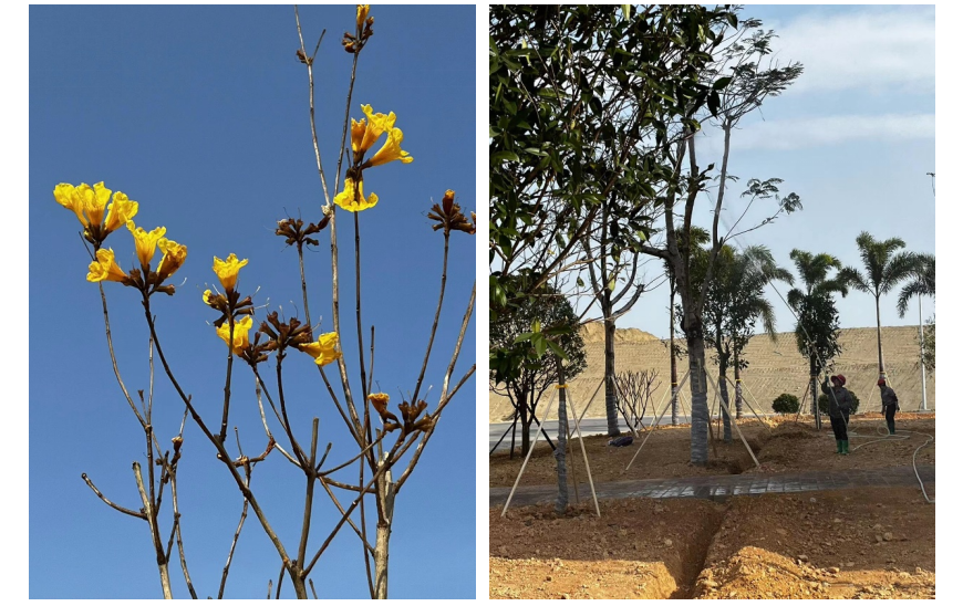 2023年3月12日,東粵環(huán)保的生產(chǎn)區(qū)域煥然一新。生產(chǎn)樓大門前的狐尾椰子樹,搖曳生姿,獨領(lǐng)風(fēng)騷;一旁的桂花樹,沉靜內(nèi)斂,毫不遜色;與其相陪襯的還有灰莉球、黃金葉球等,象征著樸素自然、清潔純凈。最引人矚目的莫過于黃花風(fēng)鈴木,黃色的花蕾映照綠樹婆娑的身影,更顯生機活力,象征感恩的寓意。